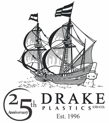 Das Logo von Drake Plastics ist eine Abbildung des Lieblingsschiffs von Sir Francis Drake, der Goldenen Hind. Das DRAKE-Wappen zeigt die Hand Gottes, die das Schiff führt, mit der Aufschrift Auxilio Divino auf dem Arm. Übersetzung: Mit göttlicher Hilfe. Die Legende der Familie Quance besagt, dass Sir Francis Drake ein entfernter Vorfahre war, da beide Familien aus der Gegend von Devon, England, stammen.